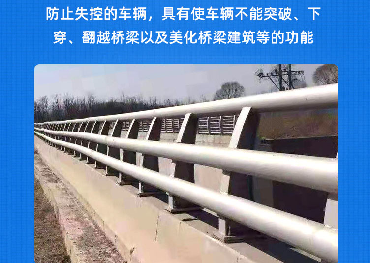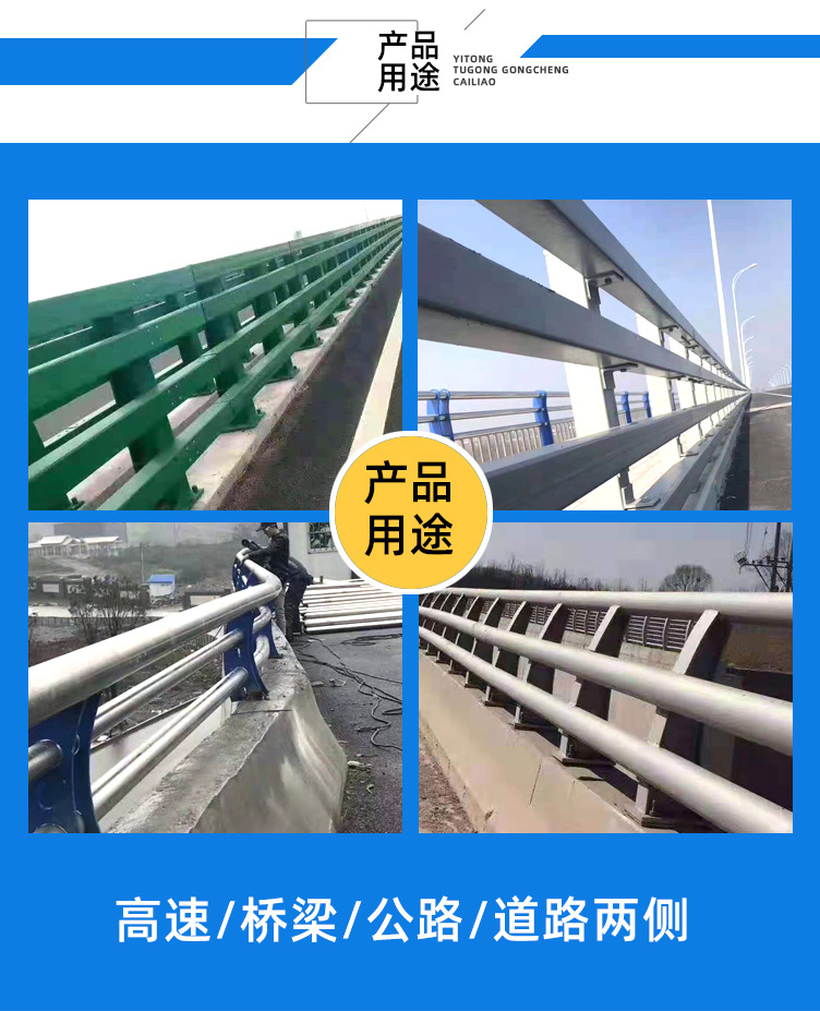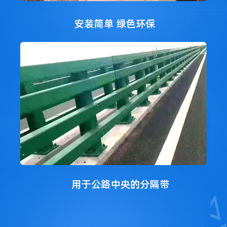 橋梁防撞護(hù)欄色彩鮮亮、表面光潔、強(qiáng)度高、韌性強(qiáng)、耐腐蝕、抗紫外線、不退色、不開(kāi)裂、不脆化的優(yōu)點(diǎn),成為具裝飾效果的護(hù)欄,適用于城市道路中間,潔凈寬敞的街道與鮮艷靚麗的護(hù)欄,互相映輝,筑起一道亮麗的風(fēng)景線,為我們的城市增光添彩;讓我們高品位的城市建設(shè)更上新臺(tái)階。保障行人安全,及交通暢通。
